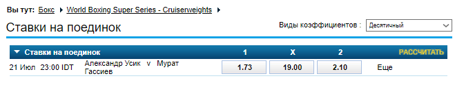 Тепер поставити на перемогу нашого співвітчизника можна з коефіцієнтом 1.73 (раніше він був 1.67). На успіх Гассієва можна “зарядитися” з показником 2.10 (був 2.25).